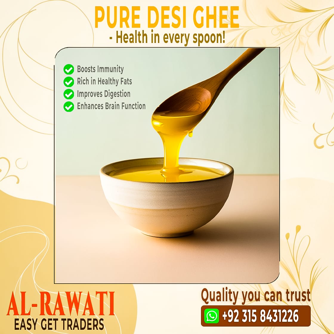 At Alrawati Easy Get Traders, we bring you nature’s finest treasures – pure, organic honey and authentic desi ghee – straight from the heart of traditional farms. Our products are free from additives, preservatives, and artificial flavors, ensuring you enjoy the wholesome goodness of nature.